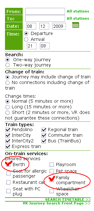 Очень нужна информация, как в интернете купить билеты на маршрут Хельсинки - Рованиеми - Хельсинки. Мы живем в Испании, собираемся самостоятельно организовать поездку "К Санта Клаусу", летим самолетом сначала до Хельсинки, побудем там дня 2, а потом хотим на поезде до Рованиеми. Будет вообще замечательно, если подскажете также примерные цены на билеты на поезд, и сколько времени идет, ну и на каком сайте можно приобрести билеты.