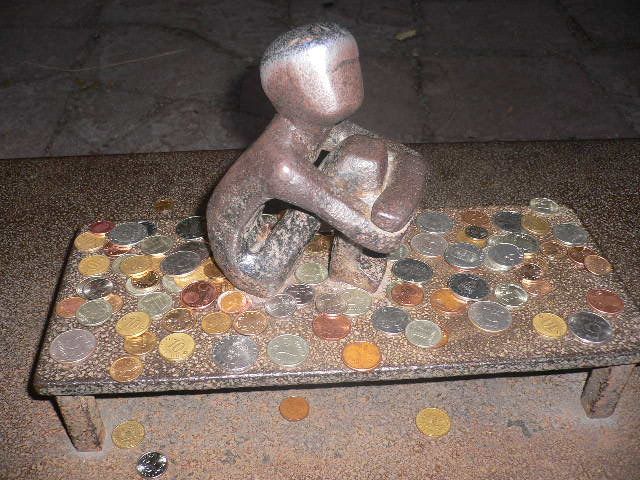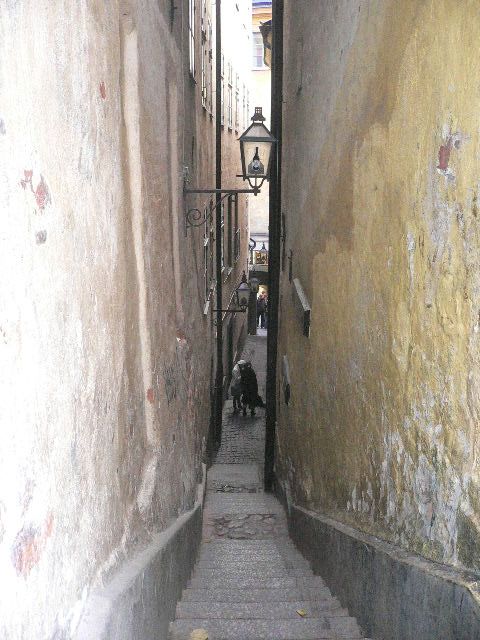 В пятницу вечером друг отвёз нас на автовокзал, автобусом мы добрались до Турку, и я всё беспокоилась, что можем не успеть, потому что после автобуса до отправления парома у нас было всего 15 минут, но успели. Про вечер и ночь на пароходе сейчас рассказывать не буду, но если кому интересно – потом расскажу. А в Стокгольм прибыли рано утром, было ещё темно. У самого терминала на асфальте прочерчена жирная голубая полоса, и надпись: «В Старый Город – следуйте за голубой полосой». Ну, мы и пошли. Я глядела вокруг с широко открытыми глазами. Мы шли вдоль залива, а по другую сторону дороги тянулась такая огромная скала, которая казалась ещё огромнее от утренних сумерек. Мы взяли с собой «навигатор», и в него ещё дома занесли несколько интересующих нас адресов достопримечательностей, поэтому мы и расстояние всегда ясно представляли, и знали куда идти-сворачивать. Город показался вдали почти сразу, да и не так уж до него далеко от терминала. Сначала мы пошли на самую узкую в Европе улочку. Она коротюсенькая, и идёт в горку-с горки, вся состоит из ступенек. Фонарики. Красивая такая. Я встала посреди этой улицы, и мои руки от одного края улицы до другого (ограничено стенами противоположных домов) были согнутыми в локтях! Люди добрые спят, на улицах никого, а я стою на этой маленькой улочке и фоткаю, фоткаю… Потом рядом со слепым музыкантом (скульптура), потом у старинного колодца… Потом всякие виды на море, открывающиеся из узких улочек-переулочков, потом лепнины на стенах и под крышами домов… Вот стали появляться редкие прохожие, но это были такие же, как мы, туристы. Горожане ещё спали. А мы шли к Королевскому дворцу, не спешили. У меня было одно «партийное» задание: отыскать в Стокгольме скульптуру «мальчика-с-пальчик», как мне сказали её название. Ну, в общем, мне сказали, что где-то в Стокгольме есть малюсенькая скульптурка маленького мальчика, сидящего на ступеньке, и что она вовсе и не спрятана, но никто её не может найти. И меня просили отыскать её и прислать фотки, и я обещала, и думала, что уж как-нибудь за целый-то день найду!