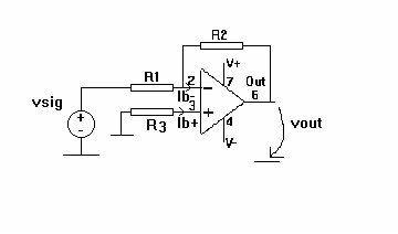 Calculate the worst case DC-error-voltage at the output of the following circuit as it is known, that the specific opamp has Ib+ = 100 nA and Ib- = 90 nA. The databook provides the following value: Voffs = 2 mV. R3=200 kohms and R1=1kohms and R2=100kohms. (max score 5 points)