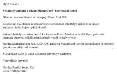 Kiistän oheiseen laskuun/tiliotteeseen merkityt tapahtumat. Korttini oli hallussani tapahtumahetkellä. Rikosilmoitus liitteenä. I have not made or authorised the use of the card for the charge(s) marked on the invoice/statement enclosed. I had the card in my possession at the time of the fraudulent use. Police report enclosed.