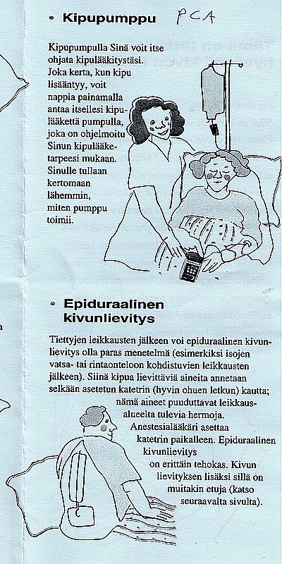 Как жена поняла нарколога, то в этом крайнем случае для снятия болей после операции есть два способа применять наркоз: "Kipupumppu" и "Epiduraalinen kivunlievitys" (см. приложение). Врач сказал, что всё это в крайнем случае, но предлжил жене на всякий случай заранее выбрать один из способов.