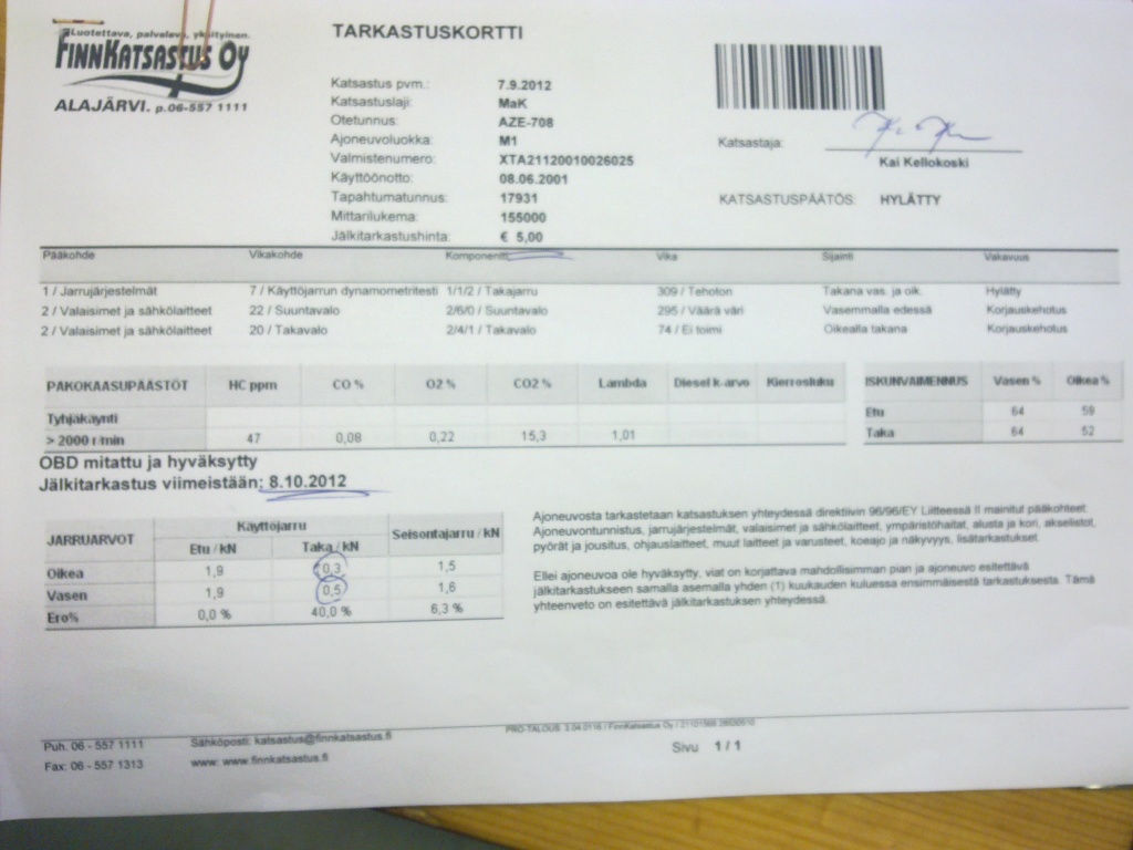 Привет всем. на днях был на катсастусе. Вышло три строки неисправности- тормоза задние плохие, задний габарит не работает, и разные передние поворотники. Решением были замена предохранителя-габарит заработал. в одном переднем поворотнике когда то жёлтая лампочка стала белой ( краска облезла) я её заменил, но вот вопрос- само стекло указателя поворота мутновато- могли ли до этого докопаться? в отметках написано väärä väri. И вот вопрос- в последней графе что значат обозначения hylätty и korjauskehotu? Просто если я приеду вновь с исправленными тормозами и габаритом, такая уж неисправность- разноцветные поворотники- что могут зарубить? и вопрос- в 3 раз уже по полной надо будет проходить техосмотр? Спасибо за ваши ответы!
