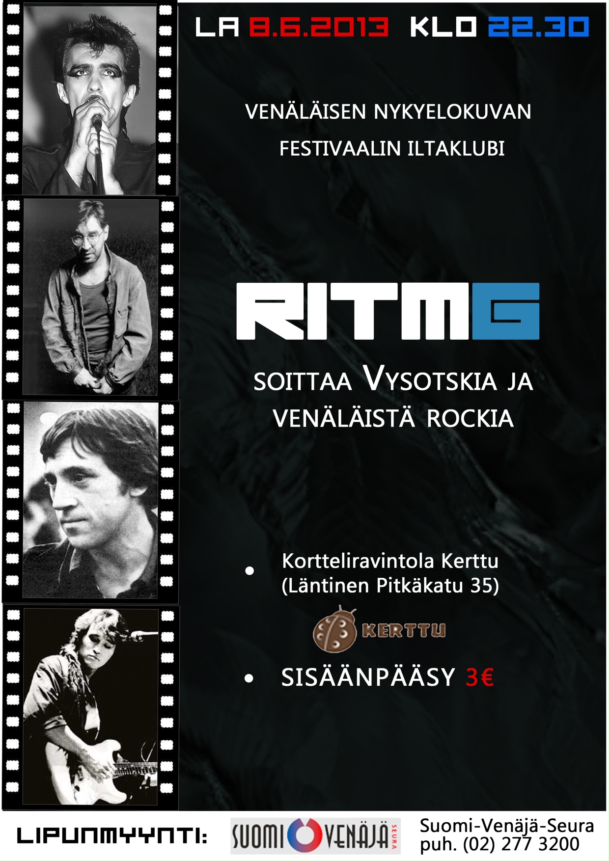 В Турку, 8.6 в честь празднования 60 летия Турку-Питер города-побратимы, будет играть группа Ritm G. Начало: 22.30. Адрес: Kortteliravintola Kerttu. Läntinen pitkäkatu 35. Репертуар - русский рок.