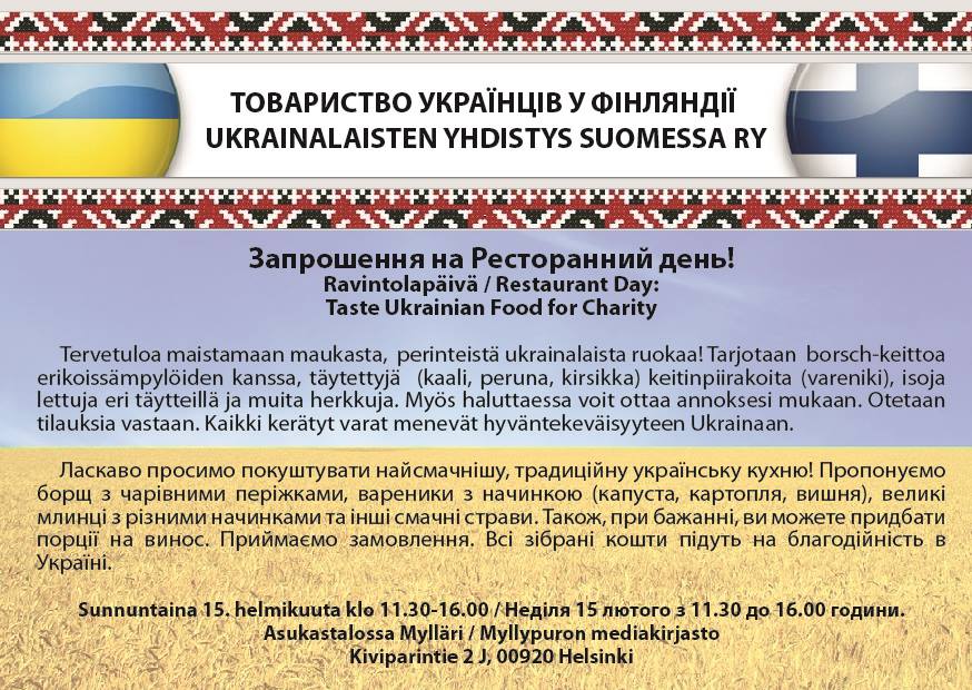 Сообщество украинцев в Финляндии организовывает ресторанный день. Можно будет поесть вкусные национальные блюда, такие как борщ, вареники… Вся выручка будет отправлена в качестве гуманитарной помощи в Украину.