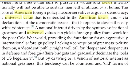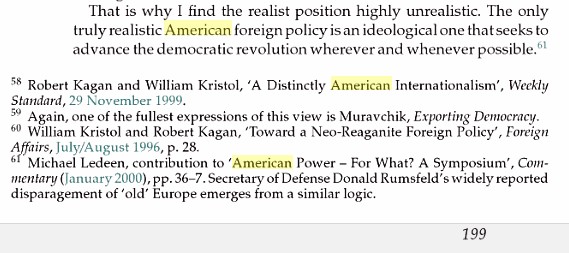 Недавно читала 'The Realist Tradition and the Limits of International Relations' , под ред. Michael C. Williams, там есть об этом. Вернее, объяснение, почему 'American ideals are universal values' и что следует за этим в плане внешней политики США. В книге есть мнение известного американского политолога о том, что американская политика - идеологическая, то есть проводится с точки зрения идеологии. Ну, как и в бывшем СССР была или как в третьем рейхе. А идеология третьего рейха известна- "Wir über alles'.