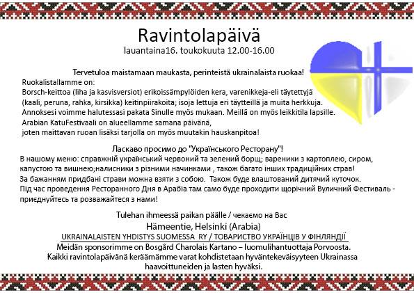 Товарищество украинцев Финляндии в очередной раз организует поп-уп ресторан украинской кухни в субботу, 16.5. с 12 до 16. На сей раз мероприятие будет проходить в районе Арабиа, на улице Хäмеенкату. Улица будет частично перекрыта для проведения ресторанного дня.