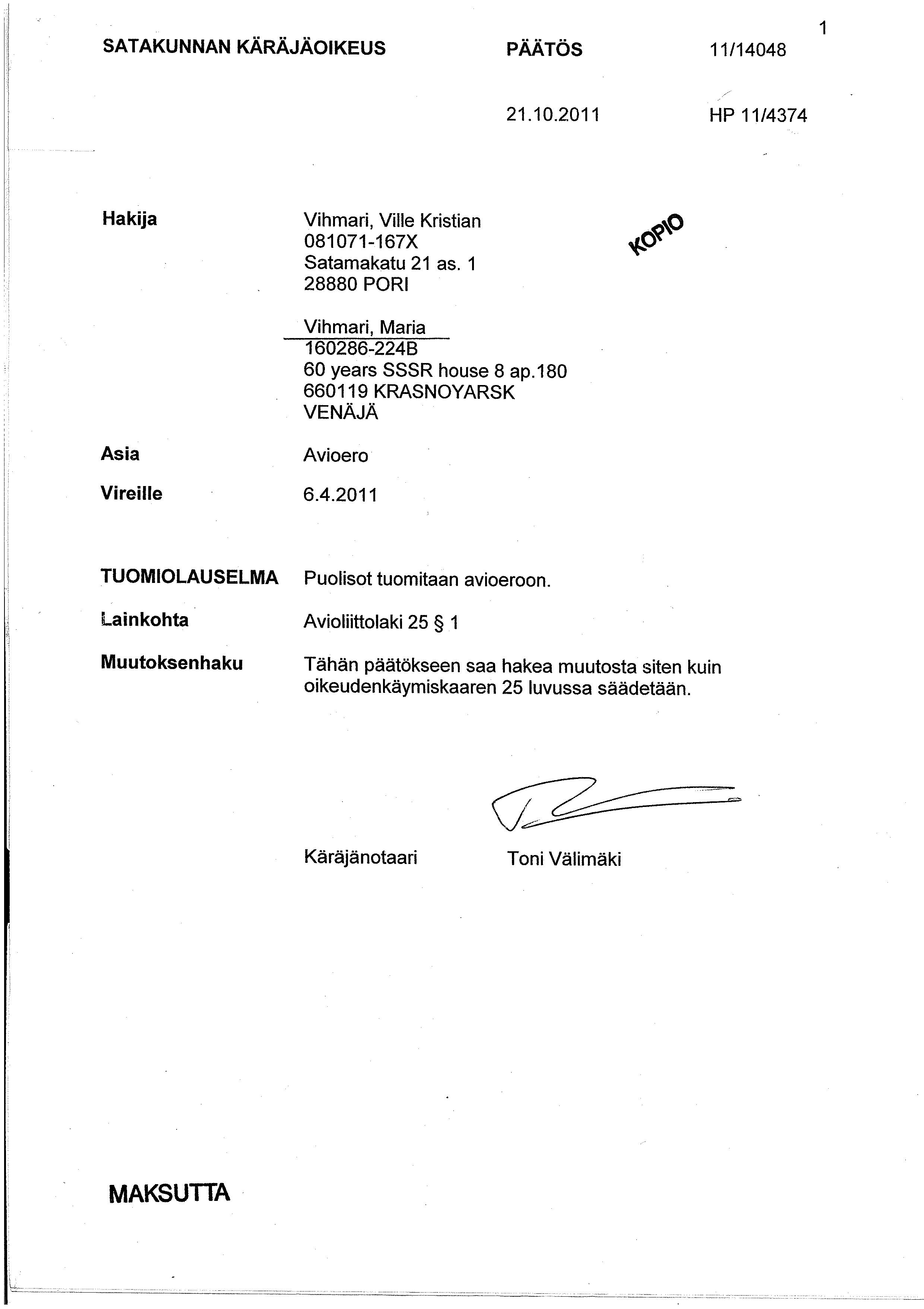 Альтернативный способ - получить дубликат решения суда в самом суде, а затем в магистрате поставить апостиль, удостверяющий полномочия того сотрудника käräjäoikeus, который этот дубликат заверил. И также сделать заверенный перевод этого апостиллированного дубликата в России.