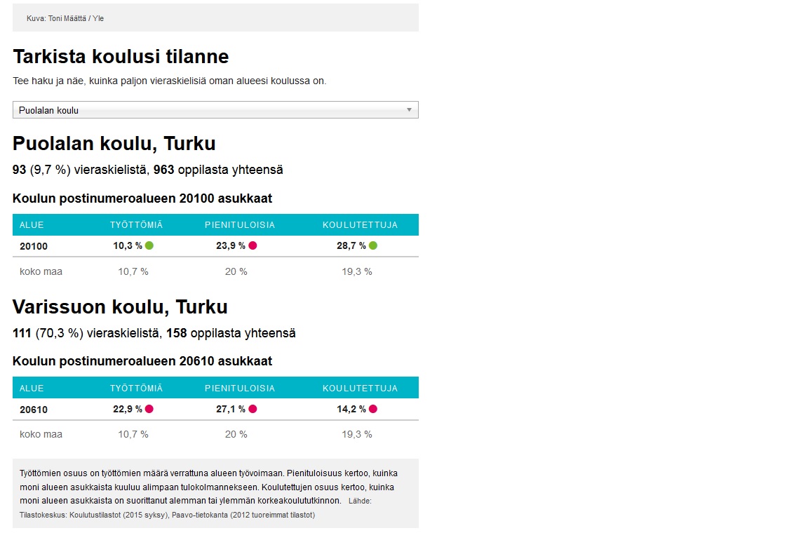Статья опубликована в конце прошлого года. Там можно выбрать название школы и увидеть: сколько в школе детей у которых родной язык иностранный, сколько всего детей в школе, сколько % безработных в этом районе, сколько % Pienituloisia, сколько % Koulutettuja. И так же показывают для сравнения всё начиная с безработных в процентах по всей стране.