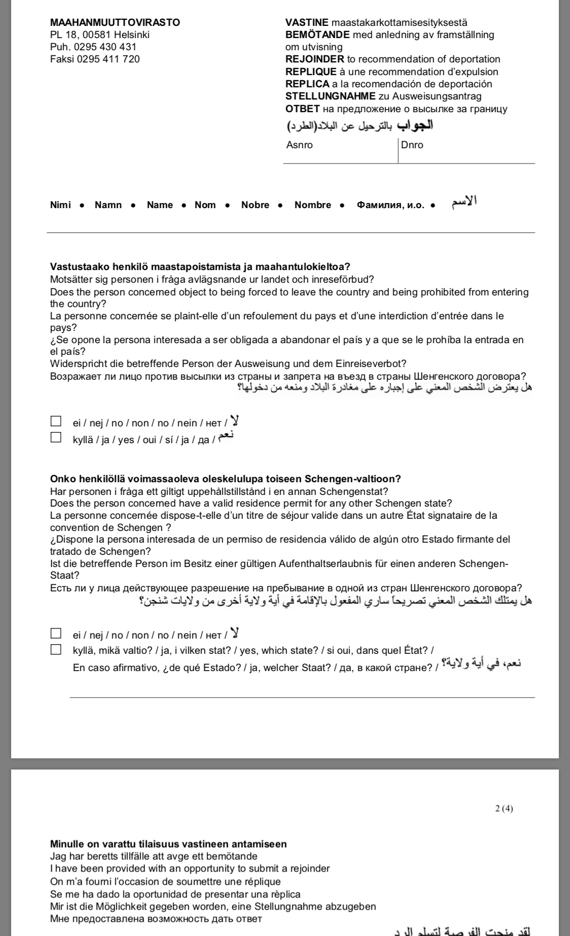 Возражение / мнение и запрошенные документы должны быть представлены в Иммиграционную службу Финляндии в течение двух недель с даты настоящего письма. Иммиграционная служба Финляндии может решить вопрос, даже если информация не будет предоставлена в течение указанного времени. Отсутствие дальнейших разъяснений может быть вашим недостатком при решении вопроса....»