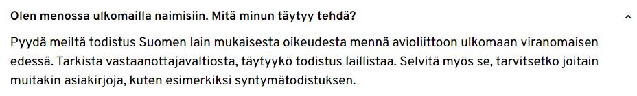 И нигде не сказано, что todistus Suomen lain mukaisesta oikeudesta mennä avioliittoon ulkomaan viranomaisen edessä. Tarkista vastaanottajavaltiosta" нужно заверять министерстве (каком? Внутр.дел ?) И затем везти в konsulatti той страны где сочетаются браком. ( печать ставить, что прибыли на место?