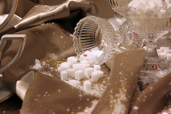 ...похоже на землетрясение на Рождество. Опрокинутые вазочки, скатерти в кучу, перья и рассыпанный сахар и конфеты. Не нравится.