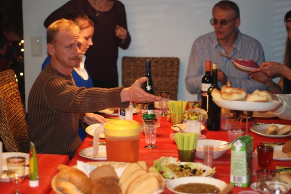 Рука тянется как раз к тарелке с пирожками с капустой и беляшами. )