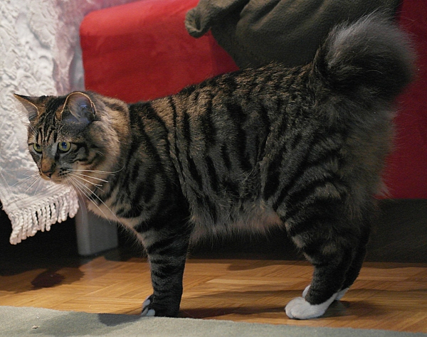 Курильский Боб-Тейл ! Поздравляю ! У меня похож на Вашего, но хвостик менее пушистый. Но окрас тот же - "полосастенький", хотя лапки чёрненькие. А вот пузико висит также, может и побольше. Нашему 4 года.