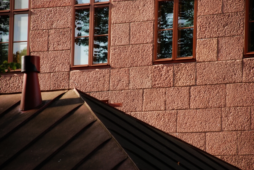 интересное сочетание цветов гранита, красной трубы и стекол