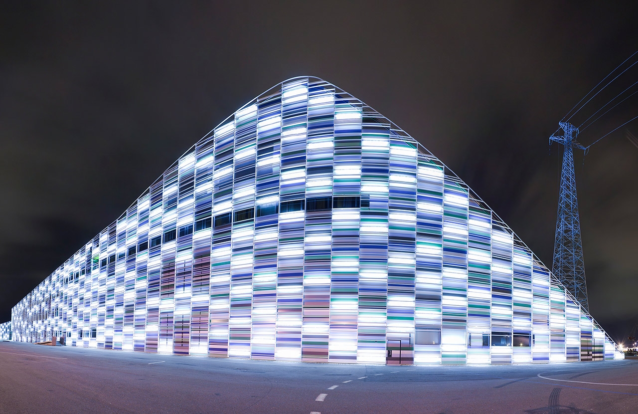 Железная конструкция с одинаковым рисунком на каждом стёклышке. Нижняя часть - как решётка, внутри храниличе для лодок. Короче, такой дизайнерский ангар. Хорошо, что хоть подсвечивают.
